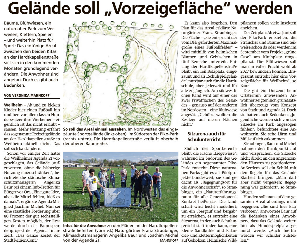 Am 17. April trafen sich Anwohner- und VertreterInnen aus Rathaus und Weilheimer Agenda 21 um Fragen zum entstehenden Freizeit- und Sportgelände an der Hardtkapellenstraße zu diskutieren. Nach einer informativen Einführung durch die städtische Klimaschutzmanagerin Angelika Baur und dem Naturgärtner Franz Straubinger war reichlich Gelegenheit alle bestehenden Fragen zu diskutieren. Die Gespräche verliefen dabei konstruktiv und lösungsorientiert. Joachim Michel, Initiator von Seiten der Weilheimer Agenda 21 dankt deshalb herzlich allen Beteiligten für den Austausch! Eine Wiederholung ist bereits angedacht. Weitere Details im Weilheimer Tagblatt hier.