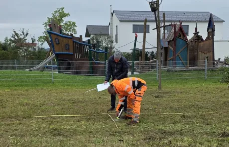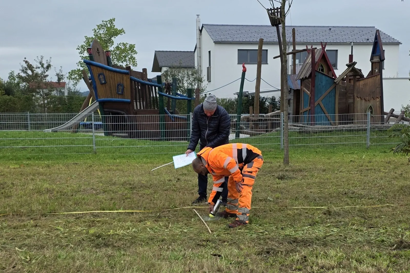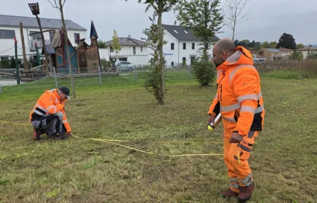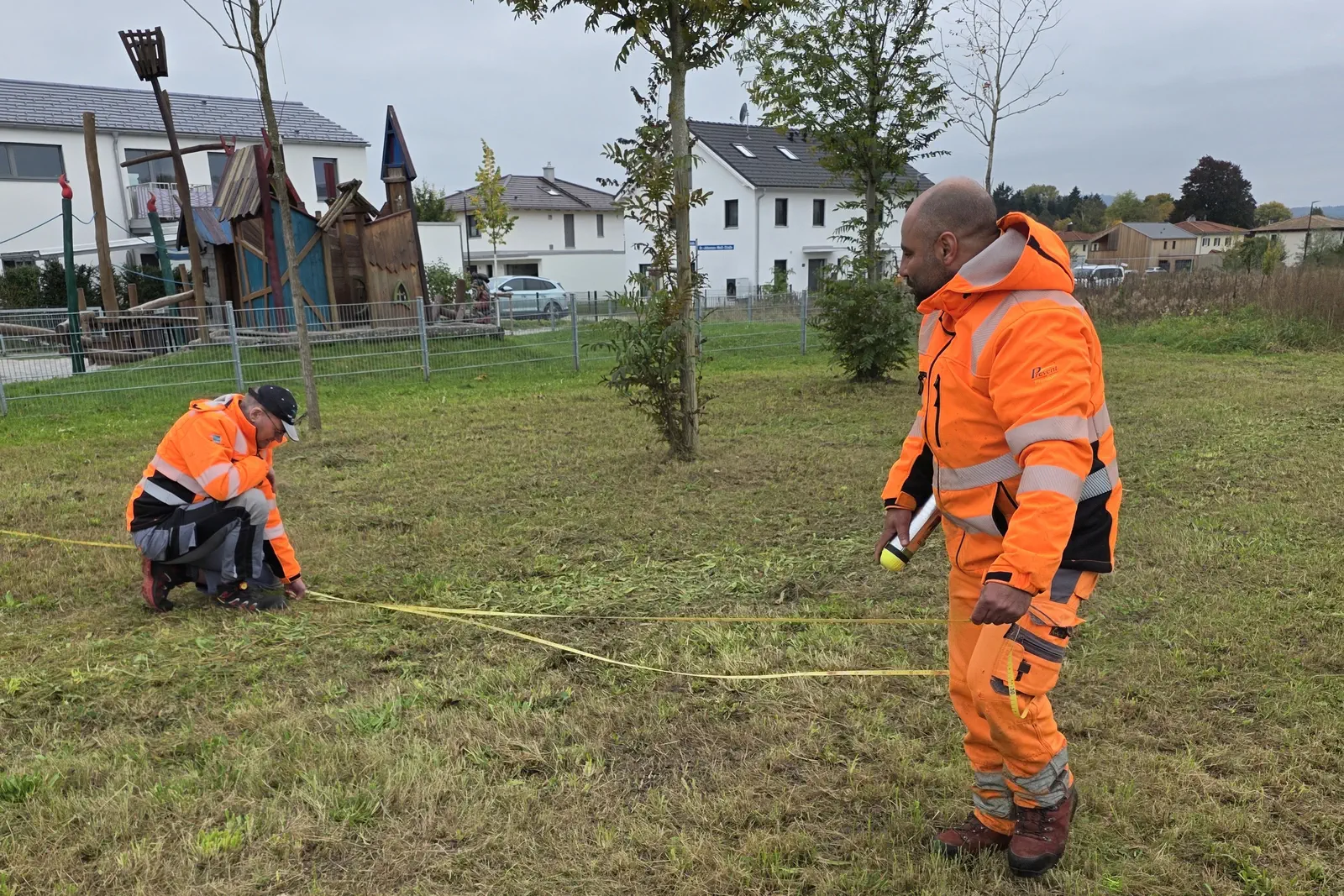 Vertreter der Stadtwerke Weilheim markieren anschließend mit Unterstützung durch die Weilheimer Agenda 21 die geplanten Pfade des Parks. Zuerst mit Bodenmarkierungen später mit Hilfe von Markierungspfosten.