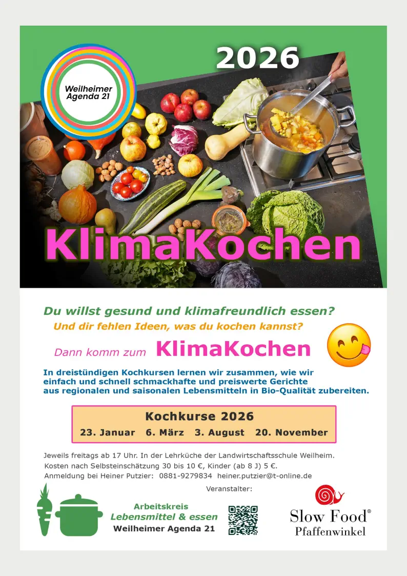 Auch 2026 bieten wir 4 Kurse „KlimaKochen“ an, in denen wir aus regionalen und saisonalen Bio-Lebensmitteln einfache, preiswerte, schnell zubereitete und leckere Gerichte zubereiten. Unser Schwerpunkt liegt auf vegetarischen und veganen Gerichten.